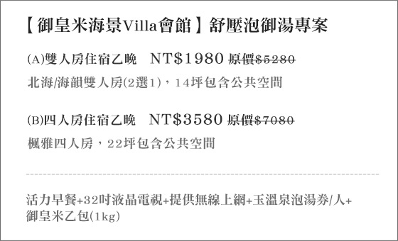 只要1,980元起即可享有【御皇米海景Villa會館】原價最高7,080元暖冬泡御湯專案:(A)北海/海韻雙人房住宿乙晚/(B)楓雅四人房住宿乙晚,專案皆含:活力早餐+32吋液晶電視+提供無線上網+玉溫泉泡湯券/人+御皇尿布墊米乙包(1kg)。